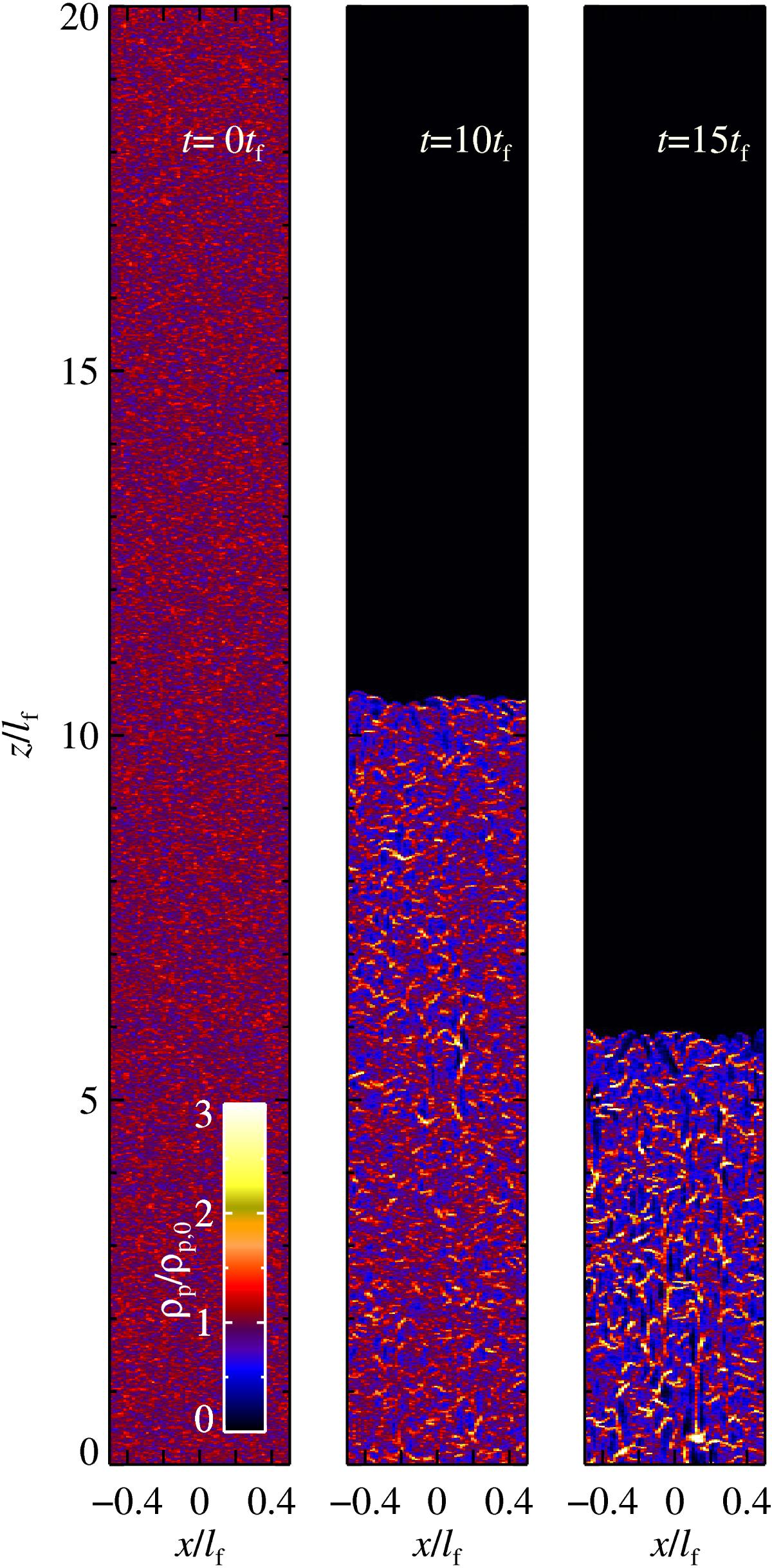 Simulation of a flow instability that is driven by the collective aerodynamic drag of dust particles in a dilute fluid. From (Lambrechts et al., 2016).